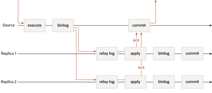 Source(Master)는 Replica(Slave) 서버가 전달받은 변경 이벤트를 Relay log에 기록 후 응답을 보내면 그때 트랜잭션을 완전히 커밋