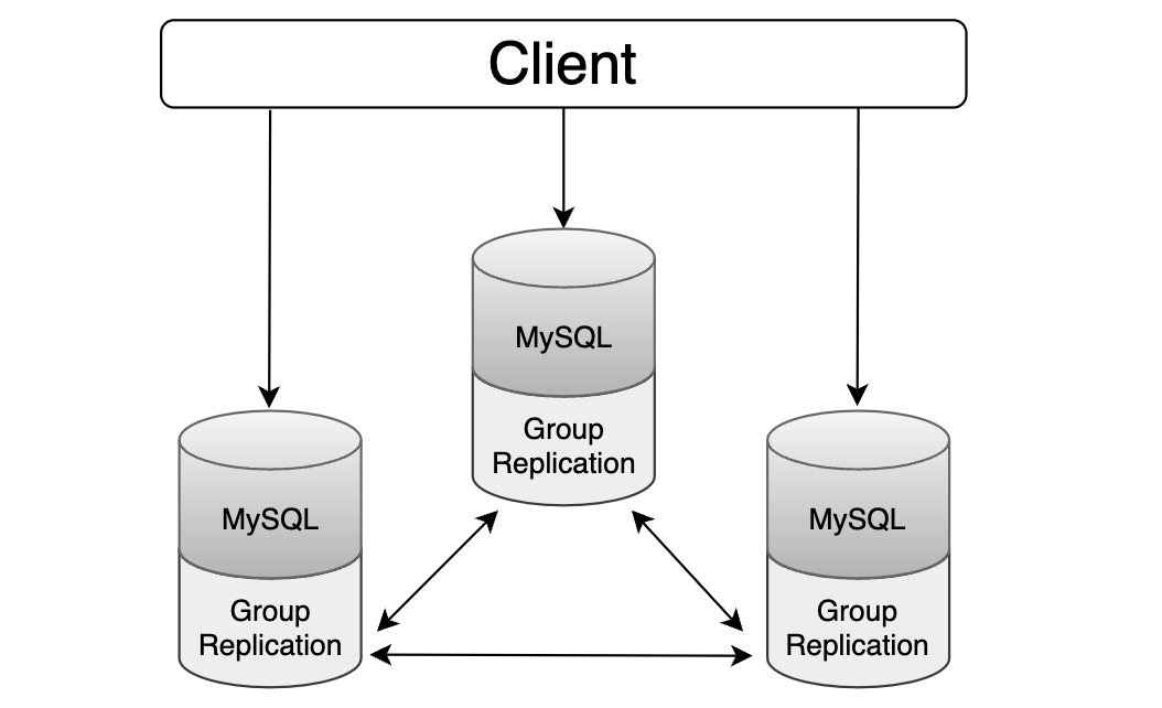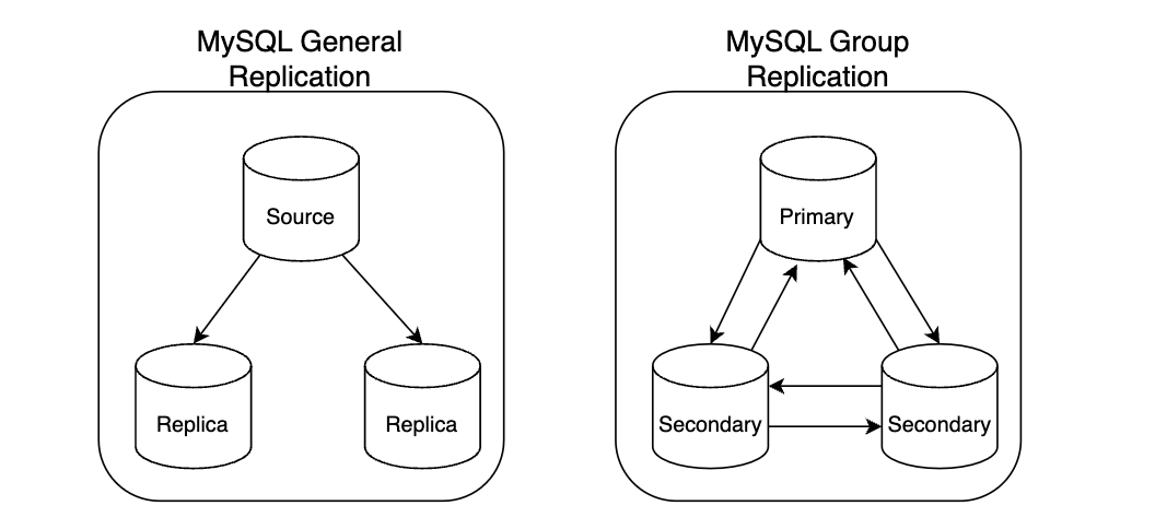 기존 복제의 경우 일반적으로 Source-Replica 형태로 구성되어 단방향 복제가 이루어지는 반면, Group Replication에서는 MySQL 서버들이 하나의 복제 그룹(Replication Group)으로 묶인 클러스터 형태를 가지며 그룹 내 서버들은 서로 통신하면서 양방향으로도 복제를 처리할 수 있다.