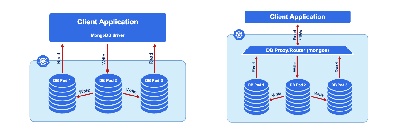 - mongos 프로세스(라우터 역할), mongod 프로세스 (드라이버 역할)
