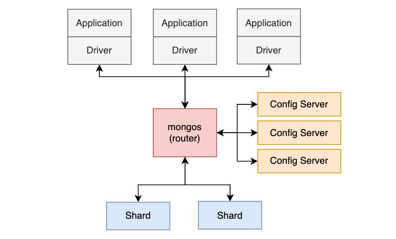 - 샤드는 라우터를 통해서만 애플리케이션과 데이터 정보 교환 가능 (각각의 샤드는 복제 세트를 가질 수 있다) - Config Server : 샤드 클러스터가 작동하기 위해 필요한 메타데이터를 저장